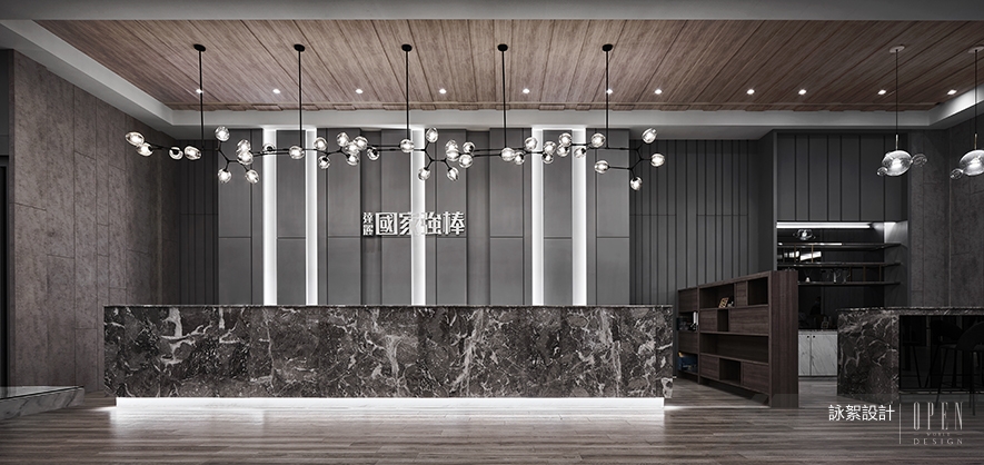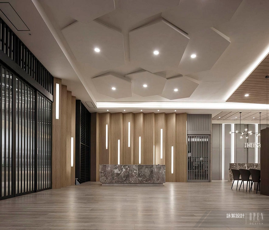 接待區劃設大塊面的造型淺色木皮天花板,形塑氣勢磅礴礡環境的同時,又不至於使空間具有壓迫感。