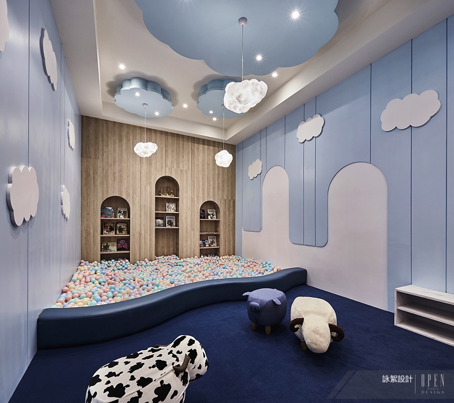 天藍色系佐以雲狀塊面,大方顯露木作造型遊戲室的童趣景緻,當中開放的球池,讓賓客在洽談中,亦能直接看望嬉戲中的孩童。