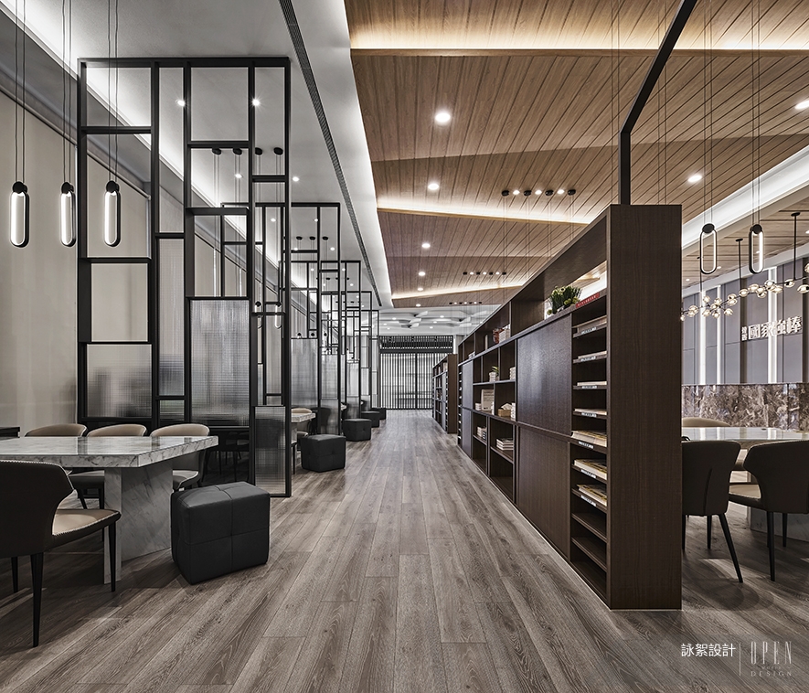考量建案討論時需取用介紹資料,因此以開放的櫃體作為空間分界,兼作收納,同時採用上方鏤空、下方鑲嵌長虹玻璃的方框鐵件,做出各個洽談區的隱私感;而其中米色皮質單椅、大理石造型桌的組合,則給人明亮舒適體驗。