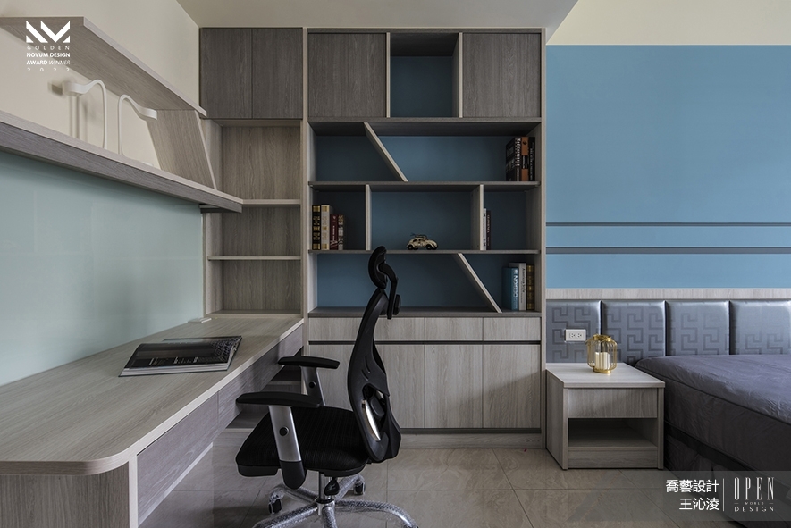 ▲依循業主一家實際生活型態,房內量身配置形式、用途多元的系統櫃體,並於男孩房增設書櫃收納空間,於書桌前加裝烤漆玻璃,作為白板與便利貼牆,方便尚在就學階段的孩童使用。