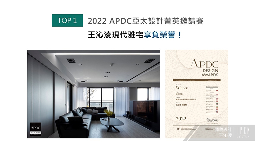 APDC亞太設計中心的核心會員由全球優秀建築師、室內設計師、產品設計師構成,不斷地促進中外設計深入的交流和互動,並將APDC設計大獎推向新的巔峰。王沁淩設計總監藉重新梳理格局拓展空間,且於木質基底上揉合洗鍊的玄色鐵件、皮革,形構俐落不失溫潤的時尚家宅《懷光深蘊》,榮獲本屆賽事「住宅空間類」大獎,於國際舞台締造品牌佳績!