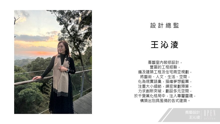 「不論是住宅、商空或其他項目,和客戶的溝通永遠是最重要的前置作業。」喬藝設計 王沁淩 設計總監 秉持熱誠真摯的服務態度,用心聽取業主每一份想望,並力求團隊持續精進設計技藝、凝鍊嶄新創想,為經手的每處空間注入獨一無二的靈魂,期待今後,王總監能令我們見識更多充盈美感的絕妙之作!