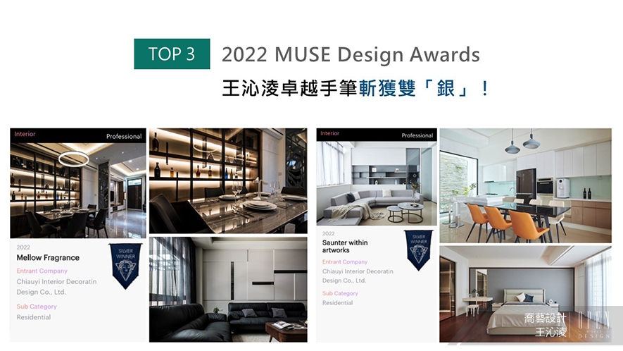 MUSE Design Awards以發掘全球設計繆思為宗旨,為建築、室內、時尚等領域提供全面的發光舞台。喬藝設計運用墨色軟裝與純白天壁形塑對比美感,搭佐線條元素共組簡練時尚宅《墨玉沉香》,另一件作品《藝・漫遊》以簡約為設計核心,規劃開放式公領域,令屋主與親友共享親暱時光,兩件作品皆獲得「銀獎」殊榮,展盡品牌美學!