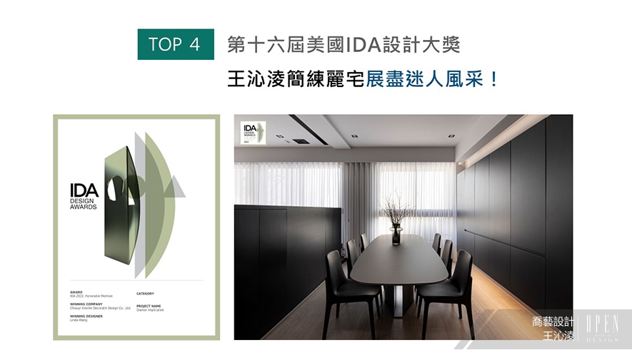 美國IDA國際設計大獎(International Design Awards),旨在表彰「設立新標準」與「突破室內設計界限」、「改變人們生活和工作空間」的優秀設計師及團隊。喬藝設計的家宅作品《懷光深蘊》,巧妙運用冷暖光源的轉換,平衡黑灰白基調與木紋地坪,多變氛圍深受評審喜愛,喜迎「Honorable Mention」榮譽獎項!