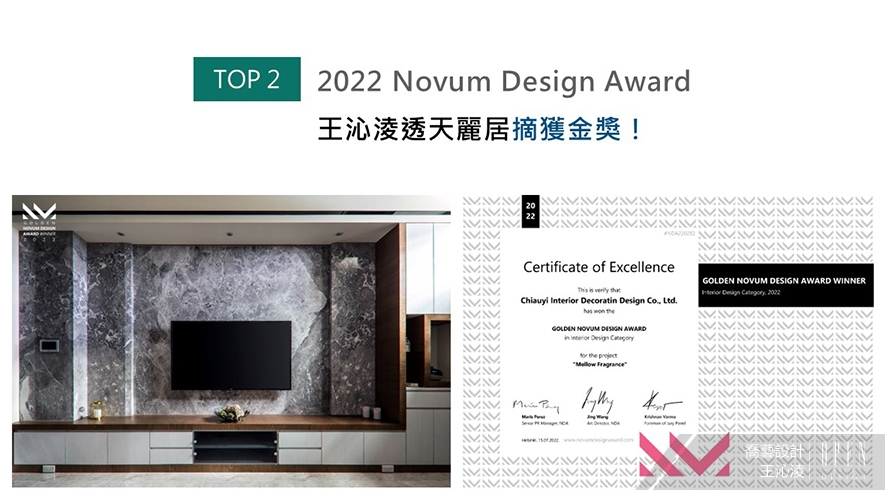 法國Novum Design Award倚著國際設計大賽後起之秀的姿態,廣納10大創意領域,包括建築外觀、室內空間設計和城市景觀設計等,為全球優秀設計者提供嶄新的展演舞台。配合宅邸原有的長型格局,王總監於作品《墨玉沉香》中規劃一字型動線,創造方便家人齊聚的寬敞公區,並活用屏風、櫃體及家具轉換區域機能,通敞透天宅深得評審團青睞,一舉奪得「金獎」榮耀!