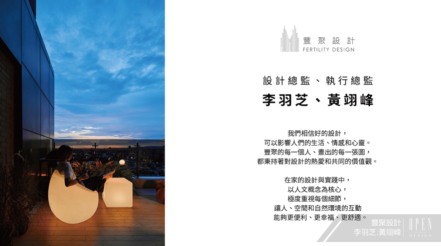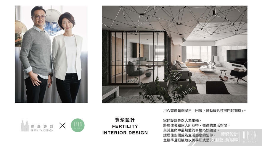 「好的設計,可以影響人們的生活、情感和心靈。」豐聚設計 設計總監 李羽芝、執行總監 黃翊峰 始終堅持以人文概念為核心,在每一案件中力求完美平衡美學與機能,使住所在提供視覺享受外,更能貼近居者的日常需求。從獲得國際大獎的肯定,到躋身專業媒體的重點報導,他們用一件件優質作品證明了對室設的熱忱跟堅持。相信未來,兩人將繼續以真摯的服務態度、精湛的手法,實現更多業主的期待,在每處點滴空間中揮灑獨特的設計韻味。
