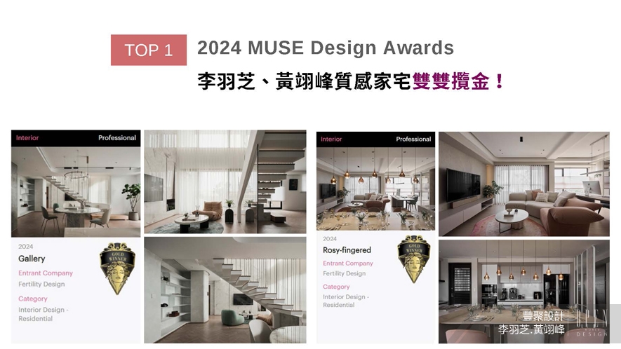 MUSE Design Awards以發掘全球設計繆思為宗旨,為建築、室內、時尚等領域提供全面的發光舞台。李羽芝、黃翊峰設計總監於家宅中調入煙燻玫瑰色及圓弧曲線,佐搭金屬、鐵件、玻璃,造就個性作品《Rosy-fingered 微粉寓所》;《Gallery 藝境》則突破傳統格局,打造通透無壓的居住空間,兩件皆獲得本屆賽事「金獎」榮譽,為品牌再添燦然光彩!