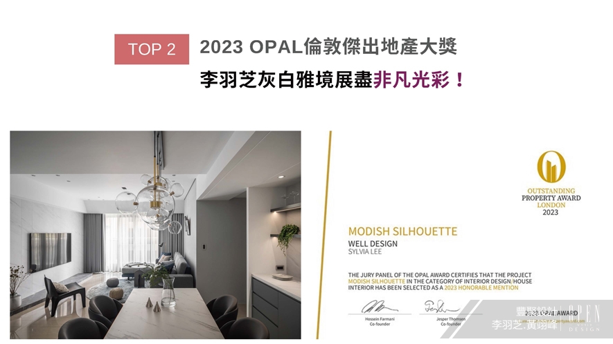 OPAL(英國倫敦傑出地產大獎)力求各地最富創造力、社會影響力與永續性的設計方案。李羽芝總監選用時髦灰白奠定空間基調,搭配仿銀狐石紋的電視主牆,打造前衛俐落的風貌,其間綴以沉穩的灰藍色櫃體、軟裝,成就靜謐舒心的細緻質感宅《上晴》,奪得「Honorable Mention」佳績!