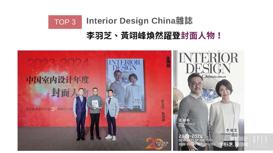 由Interior Design China主辦的「中國室內設計年度封面人物」,每年都會嘉獎數位對室內設計業界具有出色貢獻,兼具實力與社會擔當的優秀設計師。李羽芝、黃翊峰設計總監秉持以人為本的核心理念,造就一件件串聯人、空間與自然環境的愜心美作,同時,不忘專注於實踐企業ESG的環保議題,使兩人於「中國室內設計年度封面人物」的激烈競爭中脫穎而出!
