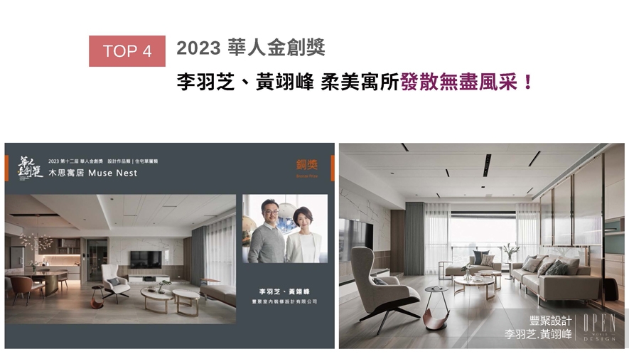 「華人金創獎」向亞洲設計菁英遞出橄欖枝,鼓勵各地傑出之室內設計師回應當代「社會設計」的深度與廣度。李羽芝、黃翊峰設計總監以低調灰白色系奠定時尚品味,透過紋理豐富的石材與點綴其中,呈現精緻輕奢的現代風韻,作品《木思寓居》一舉奪得本屆賽事「住宅單層類」之銅獎榮耀!