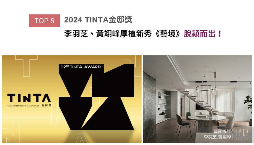 TINTA金邸獎空間美學新秀設計師大賽由台灣漂亮家居設計家媒體發起,開創台灣首個針對40歲以下青年新銳室內設計師獎項。李羽芝、黃翊峰設計總監提攜後進,特別推薦團隊成員林皓軒設計師參加競賽,讓年輕設計師獲得發揮舞台。作品中透過壁面大板磚、金屬和藝術塗料,共釀層次豐富的《Gallery 藝境》,榮獲本屆賽事「居住空間/複層住宅類」提名獎殊榮!