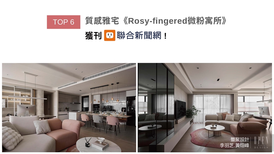 李羽芝、黃翊峰設計總監整體配色以居者喜愛的奶茶色系為基調,綴搭夢幻卻不失個性的煙燻玫瑰色,打造貼近住者氣質的質感家宅《Rosy-fingered微粉寓所》,獲得UDN聯合新聞網上刊推薦!