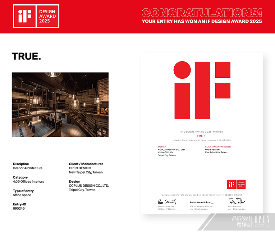世界四大設計獎之一的德國 iF 設計大獎(iF DESIGN AWARD),自1954年創辦至今,已在國際間擁有無可取代的指標性及前瞻性。2025年 iF 設計大獎由23個國家、131位設計界權威組成評審團,依據理念、外觀、功能、差異化與影響力等五項指標,自66國、近一萬一千件參賽作品中,評選出最優良的設計之作。品昕設計 設計總監 馬靜自 運用新舊交融的設計哲學,透過樓梯扶手、挑高壁面與夾層辦公室外的不規則幾何線條,創造豐富趣味的視覺層次,締造純粹懷舊氛圍的辦公場域《TRUE.初 空間》,於本屆賽事中大放異彩,勇奪2025 德國iF設計大獎「Winner」,再度彰顯品牌的卓越創意與國際視野!