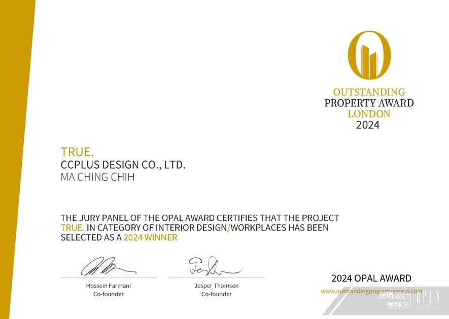 OUTSTANDING PROPERTY AWARD LONDON,OPAL(英國倫敦傑出地產大獎)由全球知名企業集團Farmani Group組織,並以招攬全球最佳建築師、室內設計師與房地產開發商為目標,在創造異業菁英聯合平台的同時,找尋各地最富創造力、革新感、社會影響力與永續性的設計方案。參與者有機會替自己最新穎的企劃,博得國際能見度,並且和產業的先驅及專業人士進行交流。以「新舊合一」為核心理念,品昕設計 設計總監 馬靜自 將復古工業風融合現代美學,從自然原木的溫潤質感到金屬幾何的俐落線條,交織出層次豐富、令人耳目一新的辦公場所《TRUE.初 空間》,其獨具創意的細膩空間表現成功打動評審,榮獲本屆賽事「Winner」大獎!