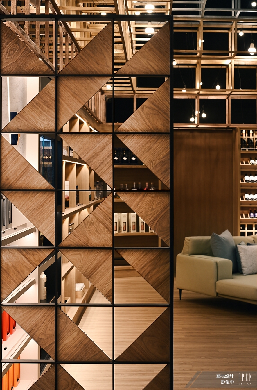 ▲販售區設置一座鐵件木片共組的穿透屏風,凸顯市場上的著名品牌;交流區設有L型沙發和單人椅,同時提供多組顧客不同座位,也營造慵懶放鬆氛圍。