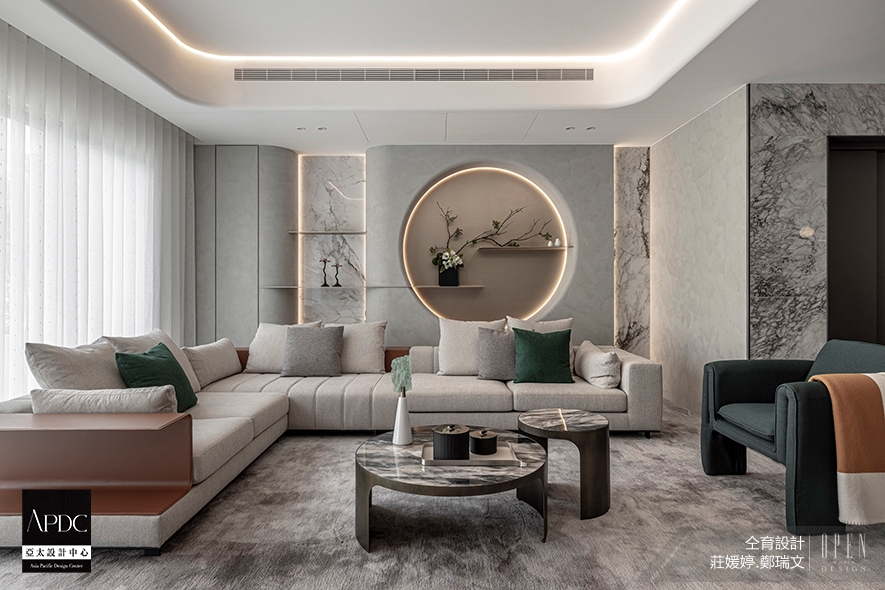 仝育設計團隊以「天圓地方」為設計概念,利用天花板造型、水墨畫般的石材裝飾,以及剛柔並濟的空間線條,打造寧靜雅緻的人文氣息;體貼入微的室內動線配置與機能規劃,如主臥的迷你吧台可供屋主歇息、品味生活,多功能室更兼顧長者、孩童、訪客的需求,展現居家美學與生活實用性的完美結合!