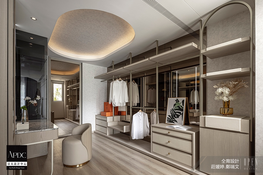 主臥進門即見的雅緻衣帽間,櫃體均以木作搭配皮革、茶鏡與壁紙打造而成,形塑精品店般的華美大氣,女主人的梳妝台也以光澤閃耀的鈦金板製成,一旁的更衣鏡則兼具隱藏衛浴門功能,開啟後便可進入洗滌疲憊身心。