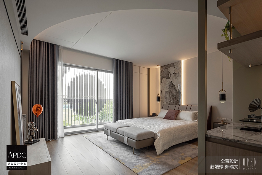 睡眠區天花板的設計採用「天圓地方」的概念,規劃為特殊的半月灣造型,巧妙結合空間結構隱藏空調機體,床頭的石材裝飾則猶如一幅天然水墨,融入飄逸悠遠意境。
