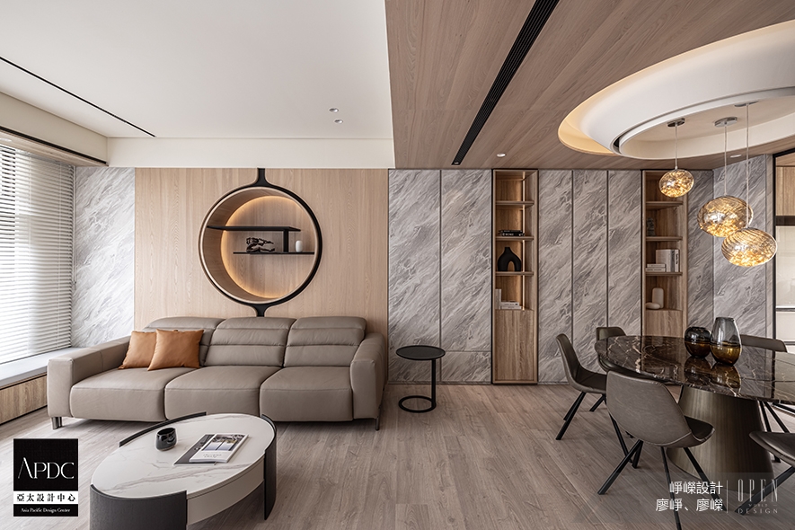 ▲家宅以「山嵐晨光」為主題,運用淺色大理石紋表現晨霧色彩,間接照明象徵和煦晨曦,並於壁面及天壁適度留白,提升明亮度之餘,也令人將目光聚焦在窗外美景、圓形端景櫃等空間亮點,細細品味自然與工藝交融的藝術氛圍。