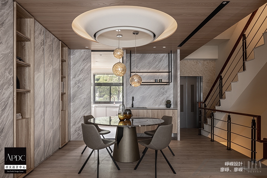 ▲餐廳選用木作天花板營造溫潤舒適的氛圍,其質樸紋理與壁櫃的大理石紋相呼應,共同呈現山嵐間的自然之美,另設計如倒置山峰的白色圓弧燈座,搭配線條簡約的精緻球型吊燈,添加一抹時尚氣息。