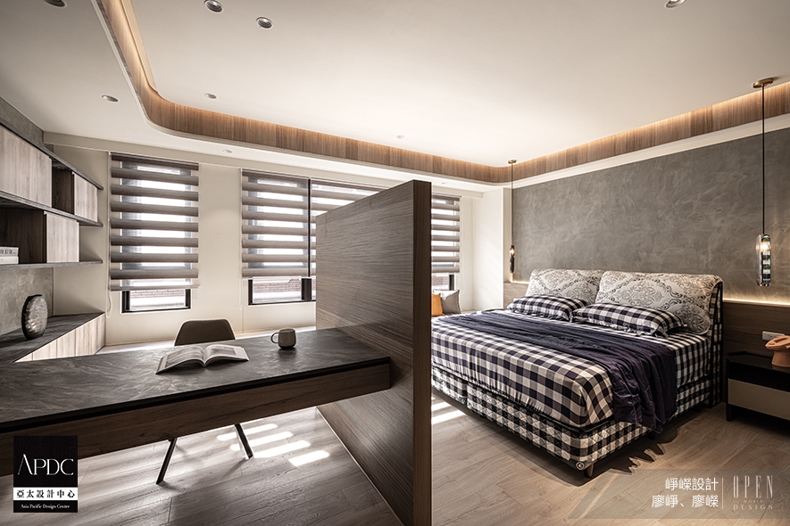▲主臥床頭選用質感沉穩的灰色斯曼特漆,並於天壁內凹側、櫃面和電視半牆陳貼木皮,打造靜謐安穩的睡眠場域。