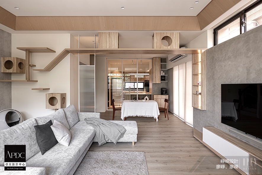 ▲因著屋主偏好簡潔自然調性,選以木質紋理與淺灰漆料,收斂出無印風格的簡約美感。機能配置以「與毛孩共生」的概念為主軸,沿著客廳做環狀設計,整合牆面與天花板,發展出「貓天空步道」,滿足貓咪喜歡居高臨下的活動習性,同時成為居家獨特的藝術端景。