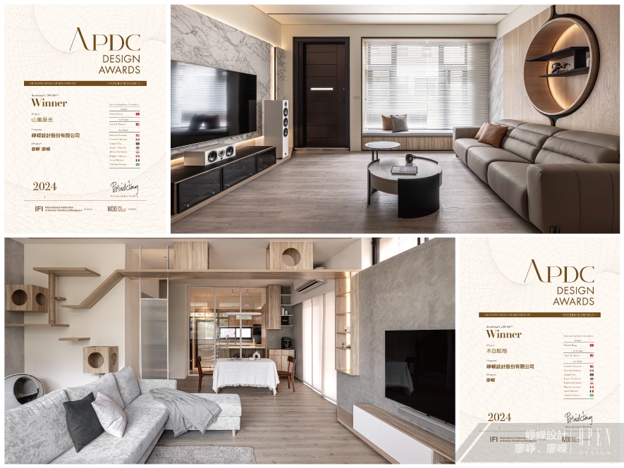 APDC亞太設計中心是室內設計聯合國組織IFI國際室內建築師設計師團體聯盟的全球成員,核心會員由活躍於大中華地區,乃至亞太地區的全球優秀建築師、室內設計師、產品設計師構成。而由該組織發起的APDC AWARDS,自2010年起每年舉行一次,今年已來到第15屆,是亞太地區最重要的獎項之一,曾與全球多個著名設計獎項,並就賽事獲獎作品相互輸送簽訂了友好合作協議。承襲「以人為本,貼近生活」的設計理念,崢嶸設計 營運總監 廖崢、設計總監 廖嶸 為長者規劃附電梯的孝親房、孩童則打造活潑明亮的成長環境,構築依需求而變的三代同堂宅《山嵐晨光》;於另一件家宅作品《木白賦格》中,將樂器收藏與貓咪活動融入居家脈絡,形構「貓‧樂」共生的日常樂章。雙作並陳,精湛演繹空間敘事,深獲評審青睞,勇奪「Winner」殊榮!