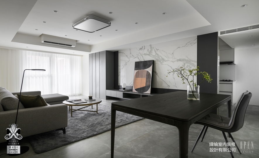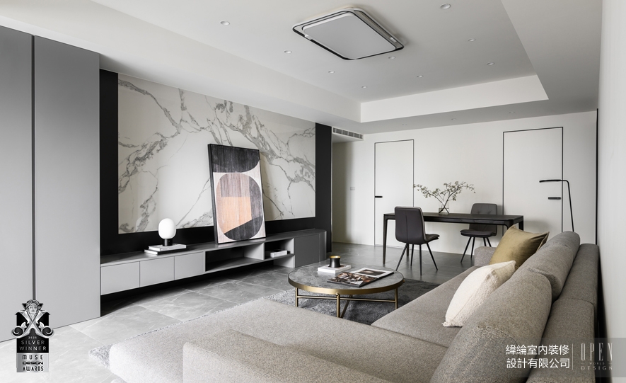 緯綸室內裝修設計有限公司 以霧灰石紋地坪為沉靜基調,透過留白牆面、灰階軟裝與相近色階的家具延展視線,使灰白大理石紋電視牆於光影間展現細膩紋理,成為沉穩主景,整體設計以極簡聚焦光影與材質,讓生活於通透靜謐中自然展開,作品《暖序》於2025 MUSE Design Awards大放異彩,喜獲「銀獎」榮譽!關於美國MUSE Design Awards
