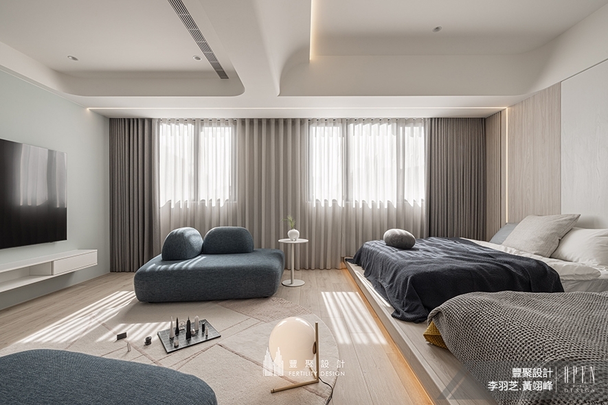 因應此案作為度假宅的項目定位,屏除原始兩間次臥的隔間牆,輔搭衣櫃及床頭整面櫃體的充足收納場所,實現得以讓兄弟四人共享共遊的大型臥室。床尾劃設一道莫蘭迪綠電視牆,為此房揉入異於他處的輕快活潑感,而天壁的曲弧收邊偕同暖光燈帶,將二房之間舊有的橫樑壓迫感消弭無存,轉而匯入恰到好處的柔潤氛圍,再藉睡眠區下方的架高地台,供予男孩們開心暢玩時,或坐臥沙發床舖、或愜意席地活動的自在無壓空間。