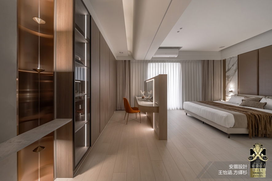 ▲主臥入門處,大面積的鍍鈦古銅色弧形牆與隱藏光源交織,如飯店廊道般低調華麗;衣帽間衣櫃以灰玻門片搭配霧面五金,在天花板環繞的弧形光影流轉間,盡展靈動優雅。