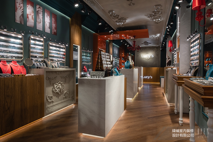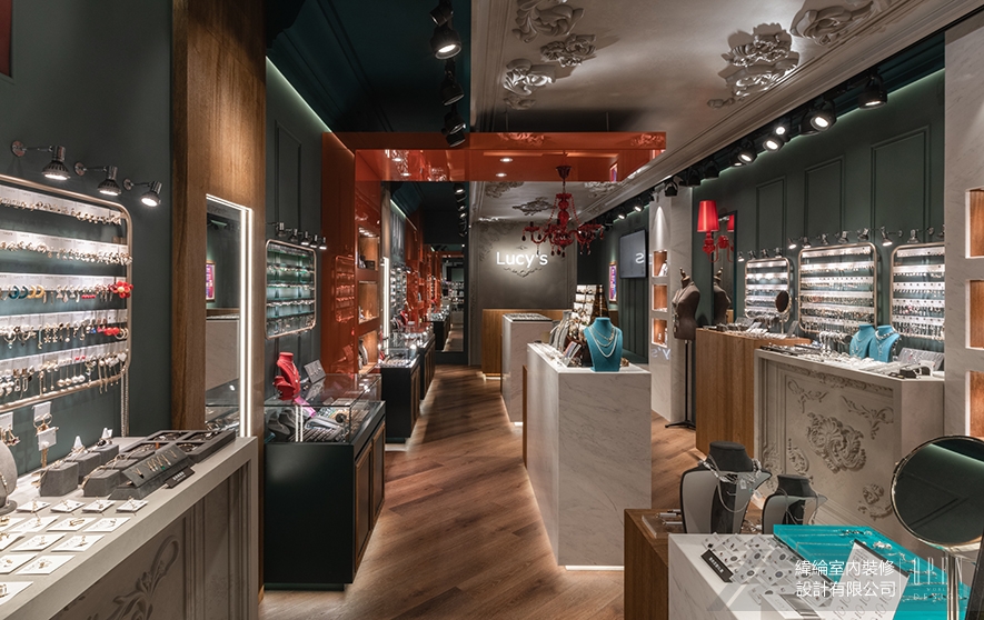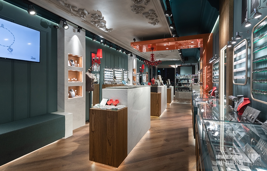 本案作為高品質飾品零售空間,主要面向追求質感與時尚的女性客群,緯綸設計 設計總監 華葦軒 遂以「低調奢華」為主軸,透過歐式雕花天花板與現代精品陳列手法的融合,並運用深藍綠與灰白為主調,鋪陳橘紅色彩作為視覺亮點,再搭配木質、霧面元素作為緩衝,營造沉穩中帶有驚喜的視覺層次,精準傳達品牌「可親近的精品」定位,令其在市中心繁華商圈的熱鬧街廓中脫穎而出,彰顯設計團隊對當代商業空間與品牌價值的深刻掌握。