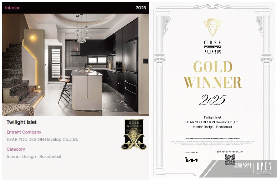 美國MUSE Design Awards致力於發掘全球設計謬思,涵蓋建築、室內、時尚等領域。2025年下半季共吸引來自124個國家、超過10萬件作品參賽,由200多位專業評審嚴格遴選,可謂最具影響力的國際獎項之一。達譽設計團隊 堅守「以人為本、環境友善」的創作初心,從細微的牆面熱感應燈為長輩與幼童點亮安全路徑,到隱藏式收納最大化家庭的開闊感受;從精選低甲醛環保建材守護居住安全,到運用LED與自然光源,打造節能健康宅《暮光微嶼》,每一處設計決策皆高度契合大賽「發掘兼具創新精神與人文關懷的設計」宗旨,喜獲2025 MUSE Design Awards的金獎佳績!