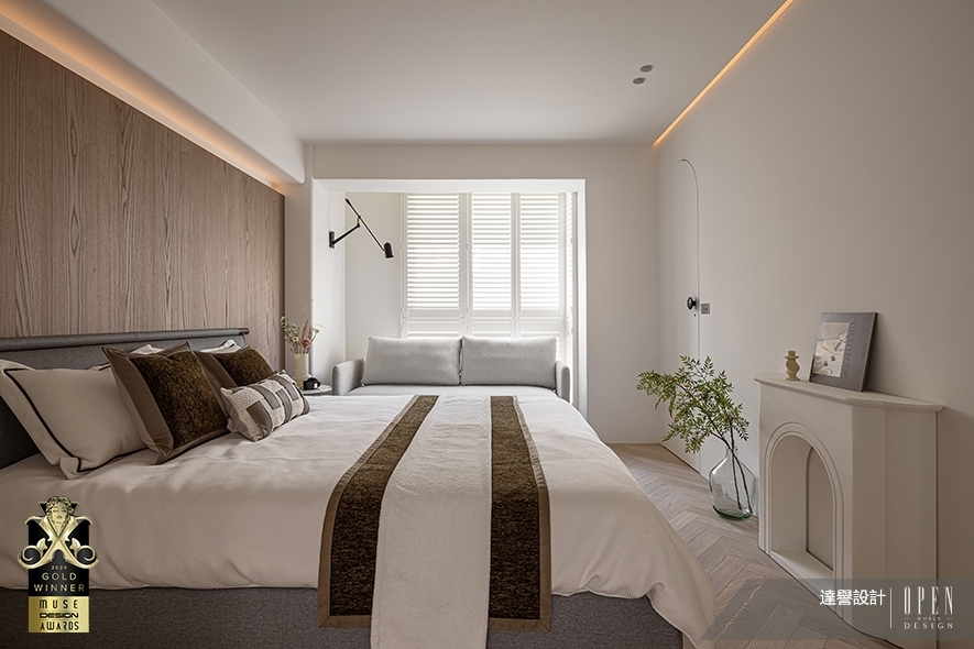 ▲主臥以淡色基調,佐以人字拼實木地板溫潤質感,搭配床頭的深色木皮作為視覺點綴,而床尾則設置壁爐造型夜燈,營造舒適溫馨的睡眠環境。