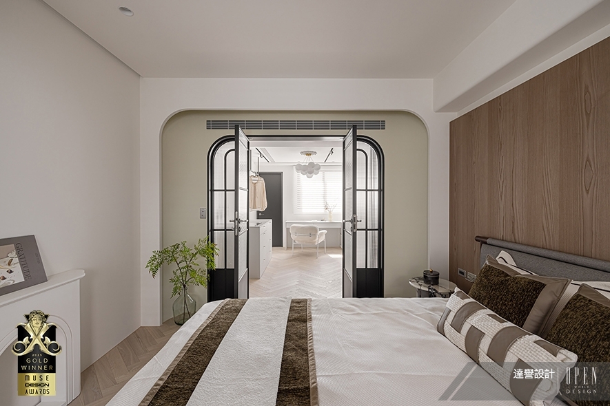 ▲睡眠區及更衣室交界處設置黑色鐵件拱形對開門,並巧妙運用原有門上大樑限制,將吊隱式冷氣出風口整合於樑下,在牆面色彩變化處延續拱形造型的木作設計,框出優美景深層次。