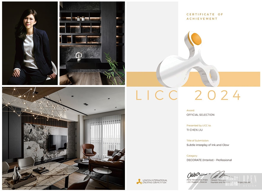 洆果設計 設計總監 劉笛榛 一向秉持友善生態的環保設計核心,於家宅《潤墨輕光》中,不僅以節能電器設備、再生綠建材減少資源耗損,更透過縝密規劃的開放式場域通道、窗戶配置,讓屋中的採光及自然通風充裕舒適,創造優良的空氣品質與家居環境;徹底落實綠建築概念的傑出作品,獲得本屆賽事「Official Selection」獎項肯定!關於LICC英國倫敦國際創意大賽