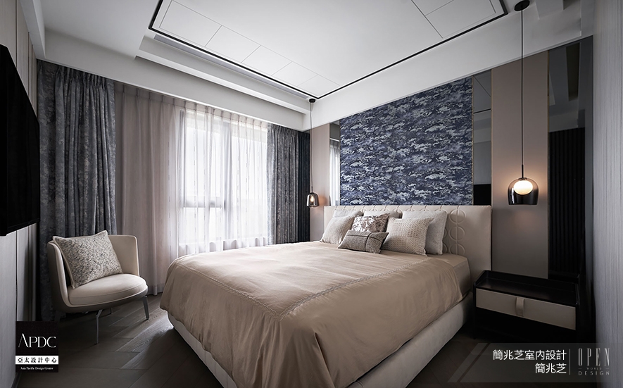 ▲主臥以灰白色為基底,營造寧靜沉穩之感,床頭背牆選用深淺交織抽象壁紙,與同色系磁吸絲絨窗簾形成和諧對話,兩者在材質視覺效果上相得益彰,為臥室增添層次分明藝術感。