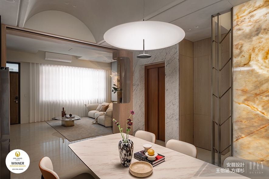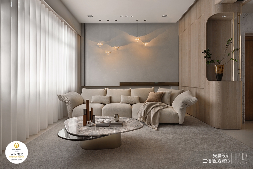 OUTSTANDING PROPERTY AWARD LONDON,OPAL(英國倫敦傑出地產大獎)由全球知名企業集團Farmani Group組織,並以招攬全球最佳建築師、室內設計師與房地產開發商為目標,在創造異業菁英聯合平臺的同時,找尋各地最富創造力、革新感、社會影響力與永續性的設計方案。本屆2025年賽事,安厝設計 主持設計師 王怡涵、設計師 方繹杉 融合華人文化、生活機能以及隱奢美學,於家宅作品《曙燁光宸》中,運用風水概念「背山面海」的吉祥意涵,沙發背牆以藝術塗料及吊燈光影勾勒綿延山勢意象,提供業主心靈層面的依靠感;對側電視牆則拼接海洋般色彩的藍、綠、白玉石,創造開闊放鬆觀感。處處蘊藏祝福寓意的優美生活端景,其富饒深厚新意的設計巧思備受評審團好評,一舉抱回此次「Winner」大獎!