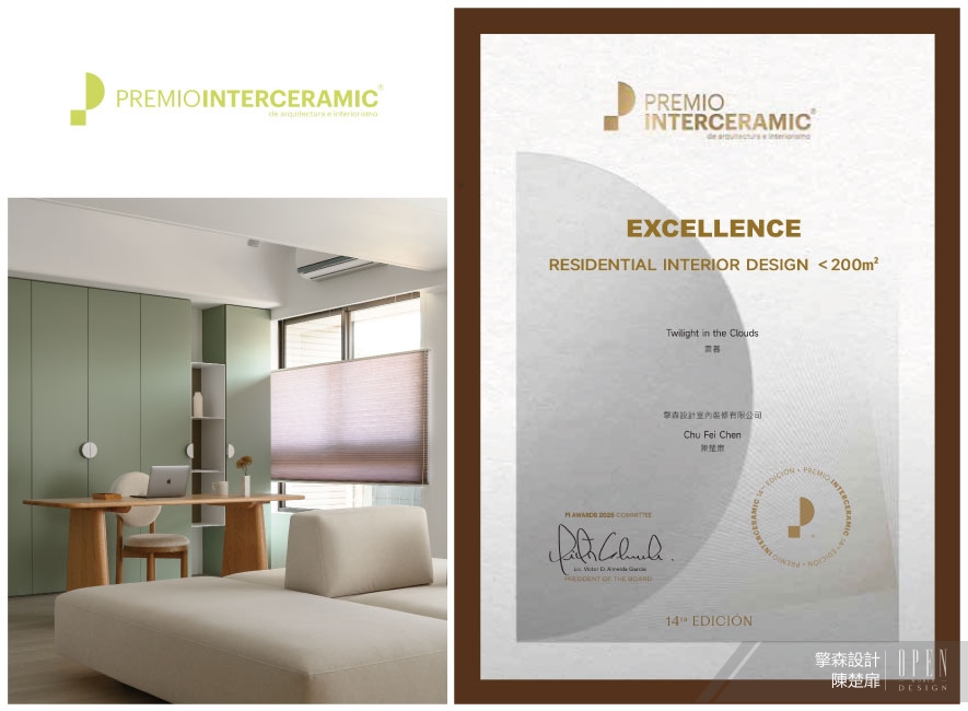 北美PI設計大獎(Premio Interceramic of Arquitecture & Interior Design),於2012年創立,旨在表彰於建築與室內設計項目中,體現最佳原創性、格局、空間結構、協調性和概念的作品,以促進建築與室內設計的發展。擎森設計 設計總監 陳楚扉 以精心之作《雲暮》參與2025年度賽事,此案將作為核心生活空間的開放式公區,透過沙發、書桌與中島餐桌等家具,劃成多條利於活動的口字動線,搭配客廳特別選配的多組雙向沙發,賦予喜愛宴客的業主及來訪親友暢行便捷的交誼場域,更與大賽著重格局與空間結構協調性的宗旨相應,於「室內設計.住宅 <200sqm」類別奪下「Excellence」獎次!