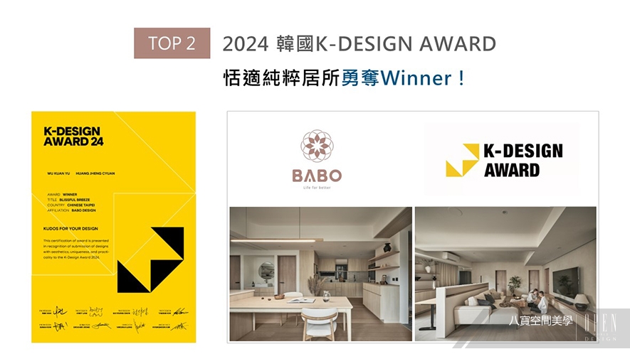 八寶空間美學於作品《禾日知丘》中,活用溫煦光影、流暢曲線勾勒寧靜景緻,開闊動線與便捷格局促進居者情誼,沉穩設計哲學及完備機能,契合韓國K-DESIGN AWARD「美感、獨創、實際性」三大主題,因而大受評審青睞,獲頒本屆賽事「Winner」獎項,為團隊新添一筆榮光!
