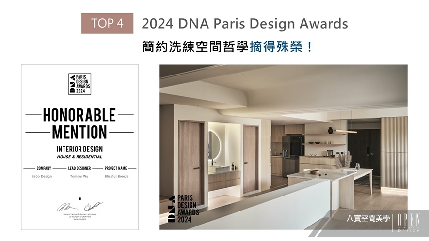 八寶團隊設計優美曲線結合柔潤木韻,其間綴入線燈的纖細柔光,營造寧靜溫婉的空靈氛圍,為嚮往純粹生活的夫婦打造理想淡雅住所《禾日知丘》,完美回應賽事「以美觀實用設計改善日常生活」之宗旨,榮獲2024 DNA Paris Design Awards「Honorable Mention」肯定,令品牌聲譽再次揚名國際!