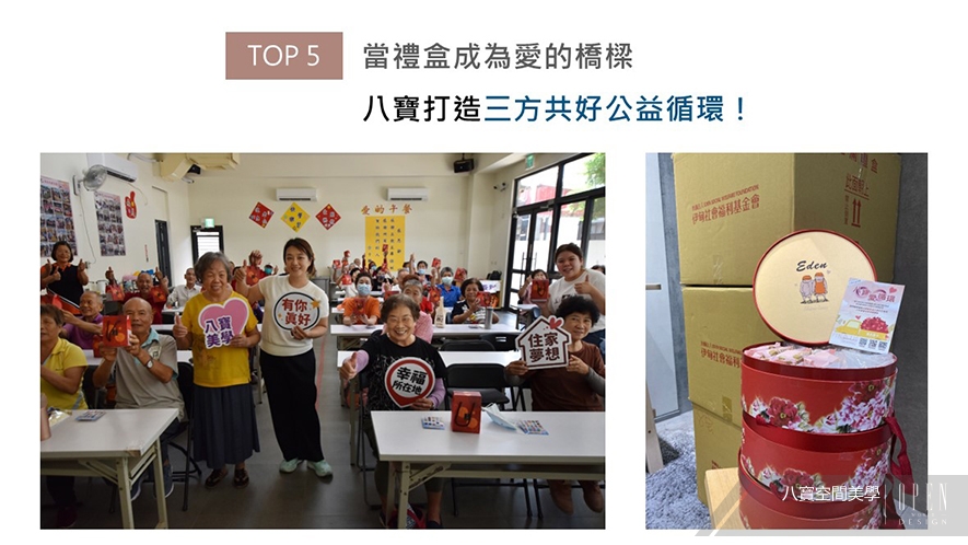 2025年的中秋、重陽雙節前夕,八寶空間美學發起「八寶愛循環」計畫,讓一份禮盒同時發揮三重效益:他們向伊甸烘焙咖啡屋訂製禮盒,使其獲得工作機會與尊重;團隊亦親自搬運部分禮盒,將其送到需要大眾關注的弱勢族群手中,不僅令企業本身實踐永續價值,眾人更都能在溫馨幸福的活動中度過佳節時光。