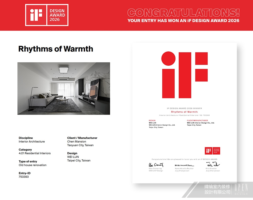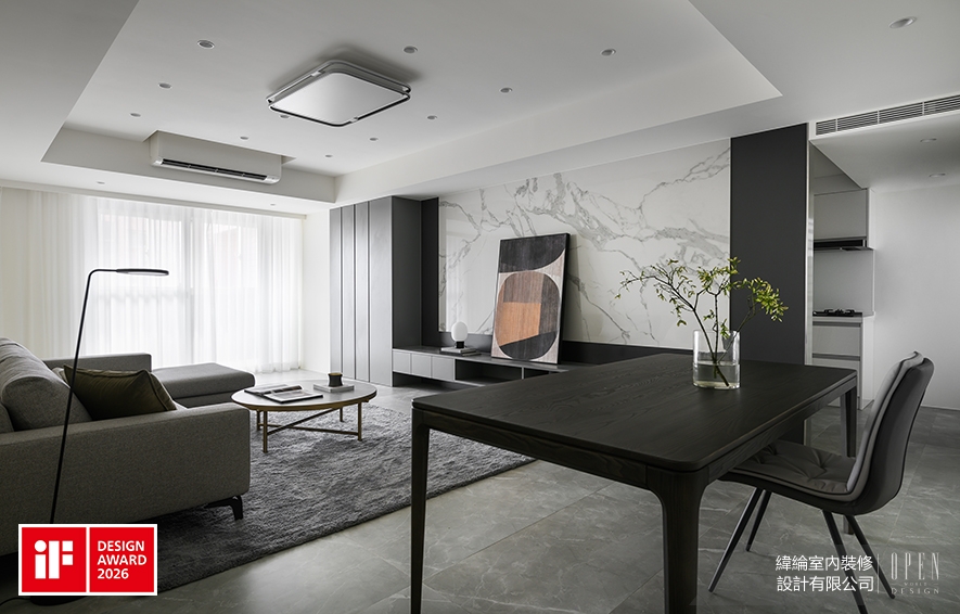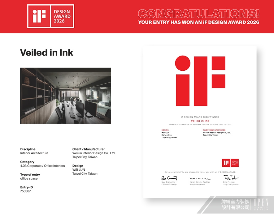 世界四大設計獎之一的德國 iF 設計大獎(iF DESIGN AWARD),自1954年創辦至今,已在國際間擁有無可取代的指標性及前瞻性。2026年 iF 設計大獎由21個國家、129位設計界權威組成評審團,依據理念、外觀、功能、差異化與影響力等五項指標,自68國、逾一萬件參賽作品中,評選出最優良的設計之作。緯綸室內裝修設計有限公司 本次精選質感辦公室《墨隱》及灰調美宅《暖序》參賽,前者一反辦公空間的制式呆版,盡室鋪敘寧謐深色基底,搭配溫潤木紋與洗鍊金屬的混搭藝韻,打造和暖且精美的工作環境;後者則運用淺灰石紋巧妙綴點留白立面,極簡內斂的純淨氛圍,切實兼容一家四口彈性多變的生活步調。兩件作品不僅帶來截然不同卻自適放鬆的感官體驗,機能動線亦貼合每位使用者的各式需求,因而大受賽事評審團好評,光榮斬獲雙「Winner」的至高肯定!