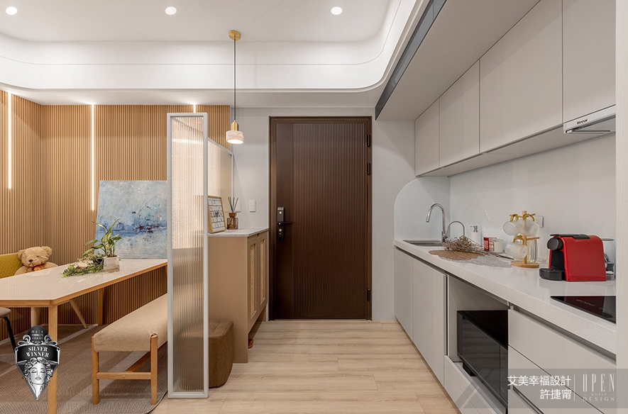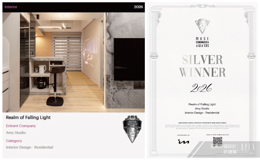 美國 MUSE Design Awards致力於發掘全球設計繆思,涵蓋建築、室內、時尚等領域。2026年共吸引來自124國、超過十萬件作品參賽,由200多位專業評審嚴格遴選,為國際設計界的重要指標。在作為設計師自用示範宅兼辦事處的《光落之境》中,艾美幸福設計 設計總監 許捷甯 活用大面積長虹玻璃、鏡面及大理石等建材,透過其反射特性延展空間縱深感,配合搭載多樣彈性功能的吧檯、榻榻米區,以實際作品達至宣傳品牌可將小宅化作視野開闊、機能充沛場域的效果;貼合示範宅和辦事處定位的匠心設計,亦緊扣賽事著重創新巧思的核心理念,成功贏得「銀獎」佳績!