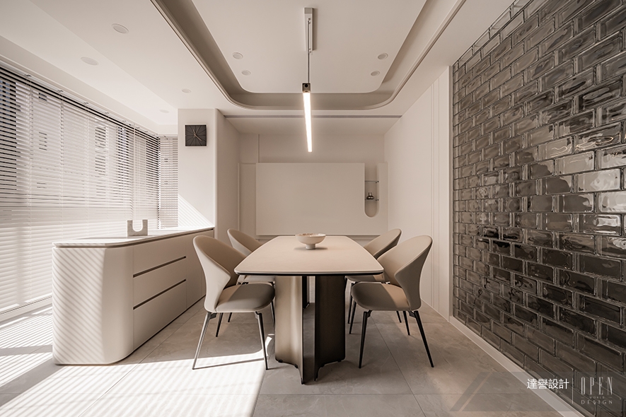 繞過樓梯來到餐廳,這道玻璃磚牆便成用餐場域最具表情的背景——磚面折射的粼粼光澤,為素淨空間注入細緻的肌理變化。天花採層疊弧線柔化結構存在,一盞纖長的線性吊燈垂懸而下,精準地為淺色石面餐桌標定出聚攏的中心;一側 L 型廚房順勢延展,藉由半高中島吧臺銜接餐區,讓炊食、餐敘與客廳的光線在同一條動線上自然流動。午後暖光順著窗沿漫入桌面,鋪開一層細密明暗韻律,共同編織出恬淡明朗的餐敘時光。
