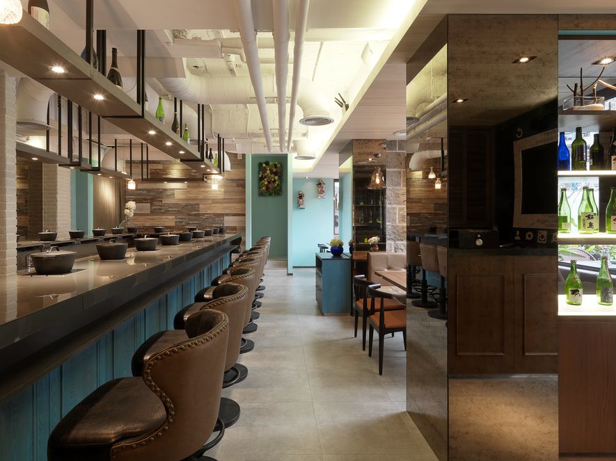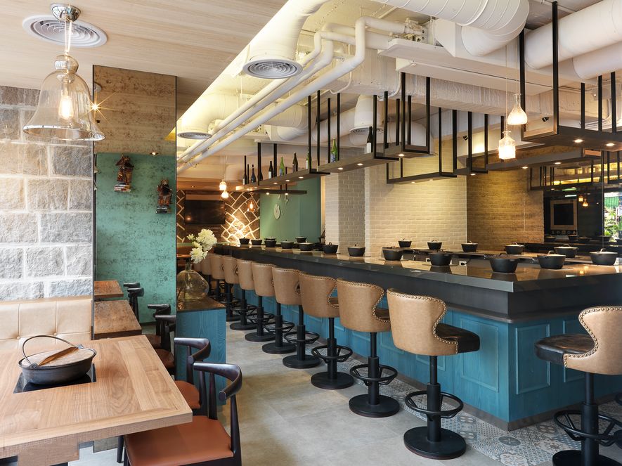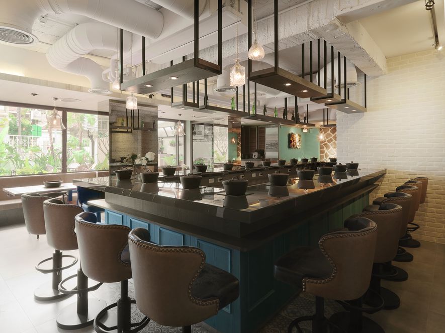 一樓的火鍋店既不全然是日式或台式風味,是業主獨家研發的秘方,因此在視覺風格上,也希望跳脫出市面上現有店面裝潢的感覺。多方討論的共識下,決定打造出輕鬆休閒的氛圍,像是在南洋島嶼用餐的愉悅自然。最後在店內所呈現出的素材樣貌,因為其材質的罕見性而更加顯得與眾不同,有著特殊的個性。