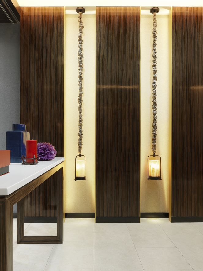 貴族氣息的導入,利用的是內歛的石材牆面,配合內崁的鏡面加上此區華麗吊燈,來營造入口尊貴迎賓印象。另外將古老吉祥的「雲彩」圖案與牆面,天花板造型,地板石材紋路結合,創造貴族符號。
