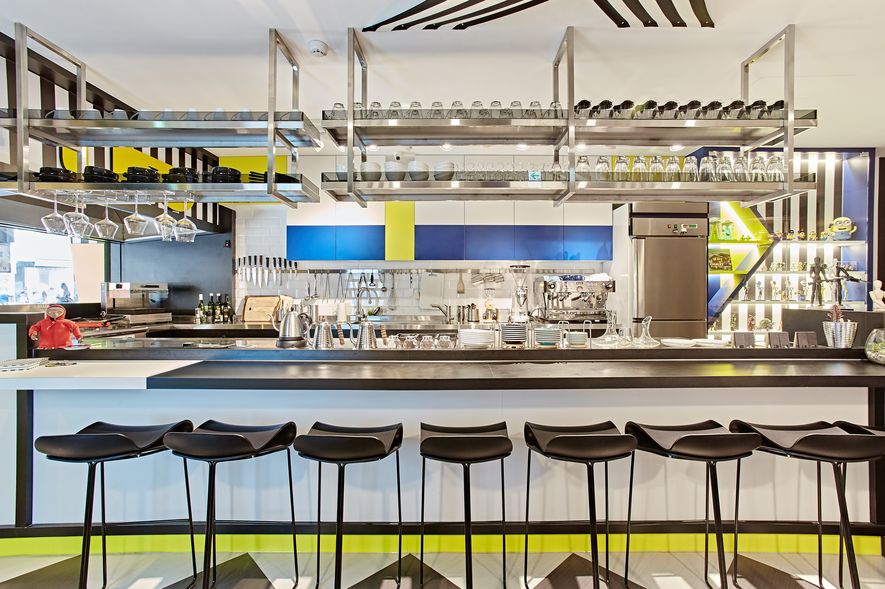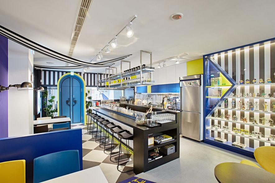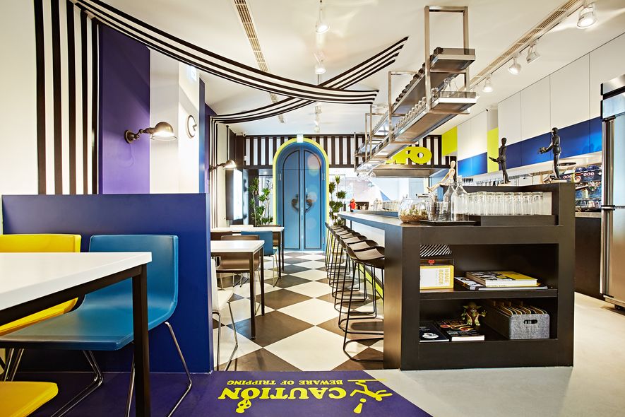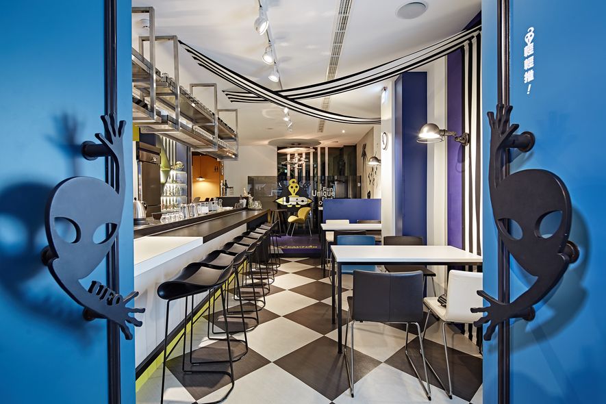設計師在空間內大玩色塊、錯視藝術,在2D的平面設計上玩出3D的立體效果,挑戰視覺認知,像是入口處運用黑白線條增加視覺的立體感、吧檯巧妙地以粗邊處理增加視覺的突出感,大膽鮮豔的黃、藍、白、黑色調讓人目不轉睛。