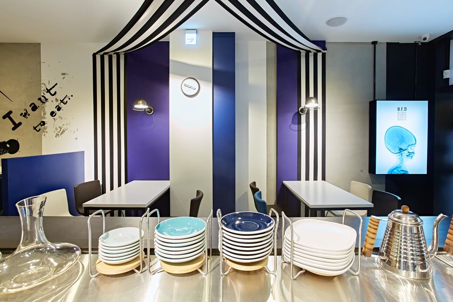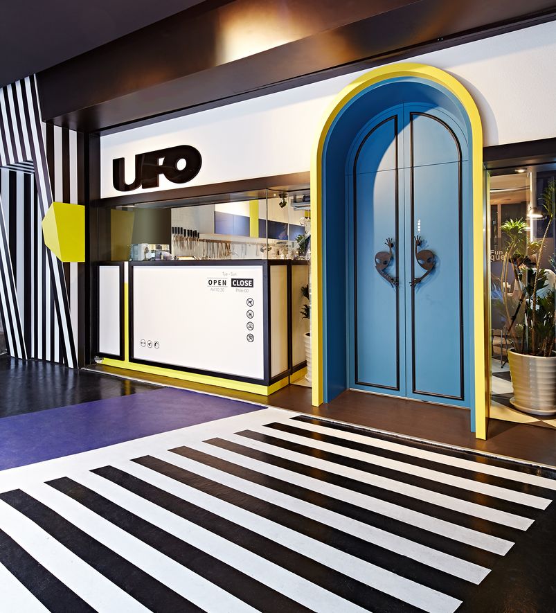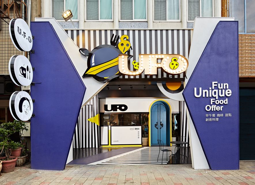 UFO餐廳透過設計師的精心規劃,門把、燈具、招牌都讓人感受到餐廳的品牌印象,從視覺設計、空間裝潢到行銷塑造,都是設計師的規劃,考量業主期待與客人的互動、收藏分享、大量收納,將機能與造型結合,打造富玩趣的創意空間。