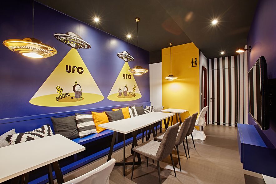 呼應「U.F.O.」的主題,設計師將外星球、外星人、幽浮的意象帶入空間,配合視覺設計整合,跳脫一般空間的設計風格,用大膽色彩、碰撞線條、獨特標示、充滿巧思的家飾,讓人在這個空間內彷彿登上外星球,感受幽浮的奇幻不思議。