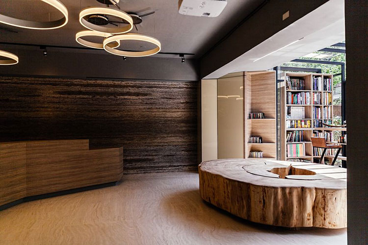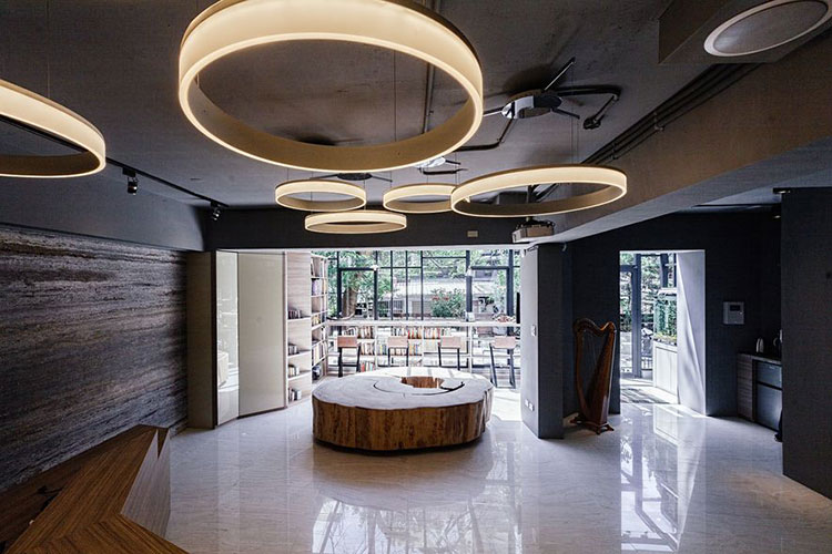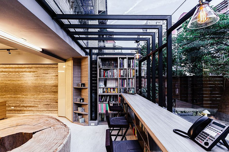 側邊的原木,是會客座椅,是討論區,是工作桌,